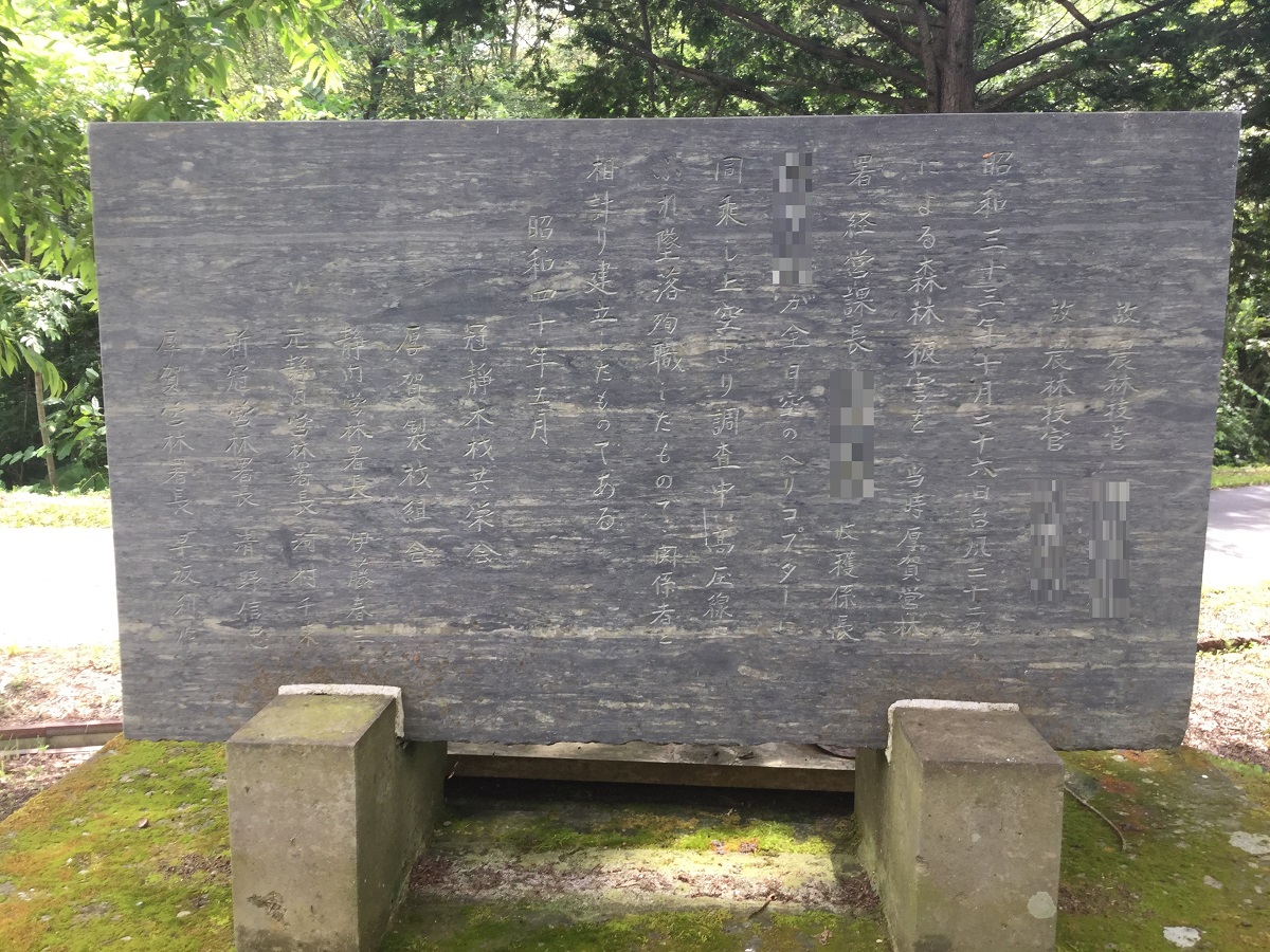 碑面にある「殉職之碑」の文字だけでは分からなかった建立の事由は背面に詳しいいきさつが刻まれており、昭和33年(1958年)にこの地であったヘリコプターの墜落事故により、搭乗していた2名の営林署職員が命を落としてしまった悲しい歴史を読み取ることができます。